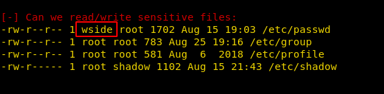 After the successful run of the LinEnum Script, we find some important information that the /etc/passwd file is readable and writable by the user “wside”.