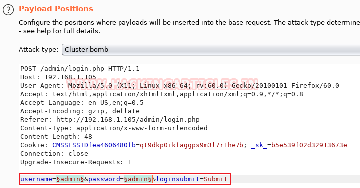 Now we will send the captured request to the Intruder by clicking on the Action Tab. Afterwards, we will open the Intruder tab and select positions (username and password) which will get highlighted as shown in the image given. Now we will select the payload position. Firstly, we will press on the Clear button given at the right of the window frame. Now we will select the fields where we want to attack which is the username and password and click on Add button. Followed by that we will choose the Attack type as Cluster Bomb.