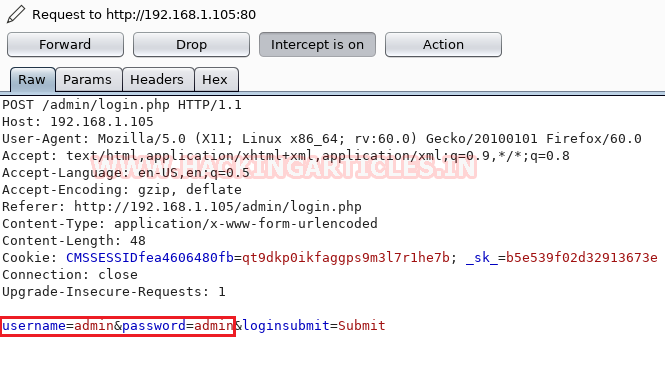 First, we will intercept the request of the login page of the CMS, where we have given a random username and password. Then click on login, the burp suite will capture the request of the login page.