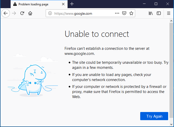 Now, by blocking ports 80 and 443 we have blocked the HTTP and HTTPS services on the remote PC and so our victim will not be able to access any website. And the following error is displayed :