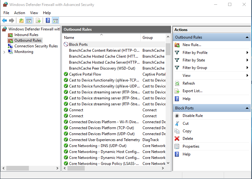 First of all, let us assume that there is a blocked port in an outbound rule in our remote PC: