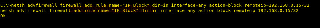 netsh advfirewall firewall add rule name="IP Block" dir=in interface=any action=block remoteip=192.168.0.15/32