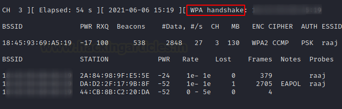 As soon as we start the airodump-ng, we will see the list of Access Points with details such as their BSSID (MAC Address), Strength (PWR), Encryption (WPA/WPA2), Authentication Method, and ESSID (Name of Wireless Access Point) as demonstrated below. We will be targeting the wireless Access Point by the name of “raaj”. We can see that the access point is broadcasting on channel 3 and has WPA2-PSK.