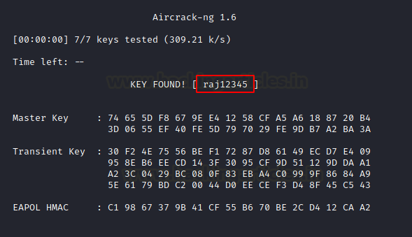 The time that aircrack-ng takes depends on your system configurations and the number of entries in the dictionary file that you provided. The dictionary that we provided had 7 keys. Hence, we were able to crack it in a matter of seconds. We can see the Master and Transient Key that would be used while forming the PSK-PTK combination. The password for the access point was cracked to be raj12345.