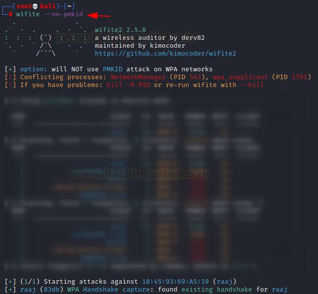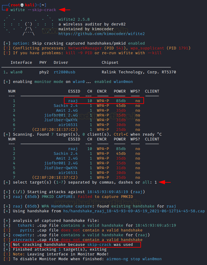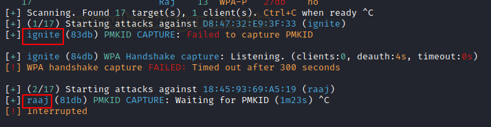 How tool works – As you might have observed in the screenshot that the tool is automatically trying all the attacks against a specified target. Here, I specified target “1” for my AP (”raaj”) and you can see that it has tried for PMKID attack first, been unsuccessful and then launched handshake capture. This process will be the same for any target. The tool will automatically determine which attack works. Quite simple and hassle-free!