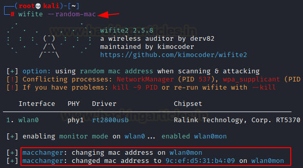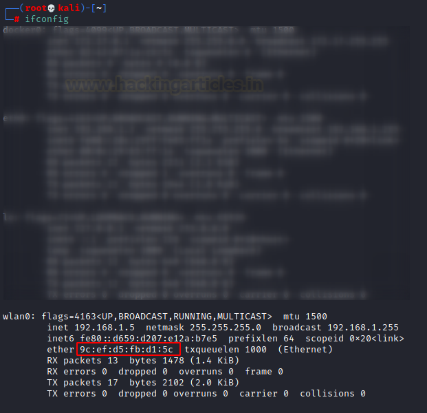MAC Address spoofing is a great technique to evade analyst’s vision and avoid getting caught by supplying the real MAC ID of your Wi-Fi adapter. First, we see our wifi card’s MAC ID by ifconfig