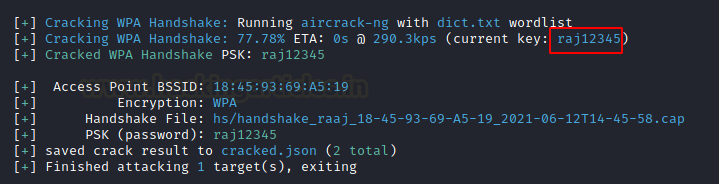 And very evidently so, you can see that it has cracked the handshake file and given out the password as “raj12345”