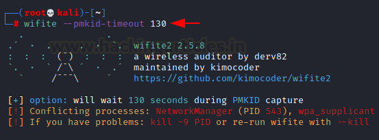 Observe how there is a timeout of 130 seconds. I’ve been interrupted before 130 seconds by C TRL+C to stop the attack. Note how it says ”waiting for PMKID (1m 23s)”