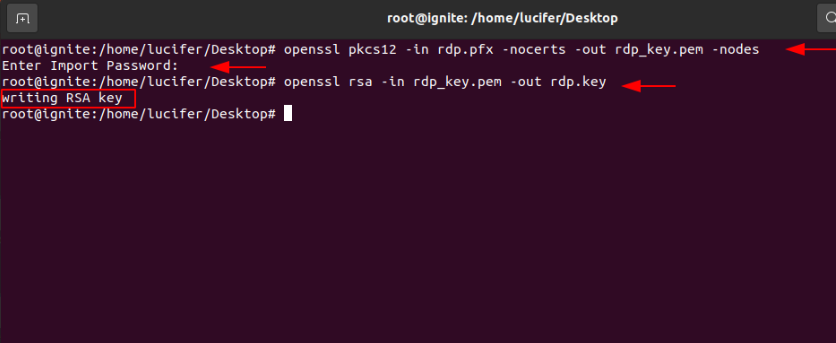openssl pkcs12 -in rdp.pfx -nocerts -out rdp_key.pem -nodes