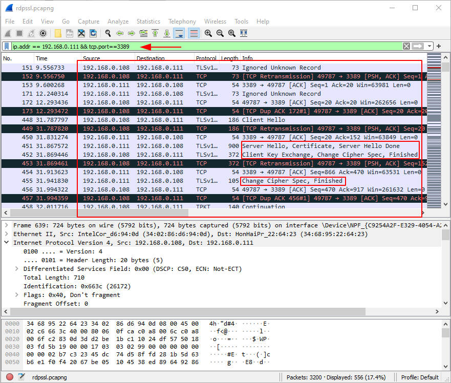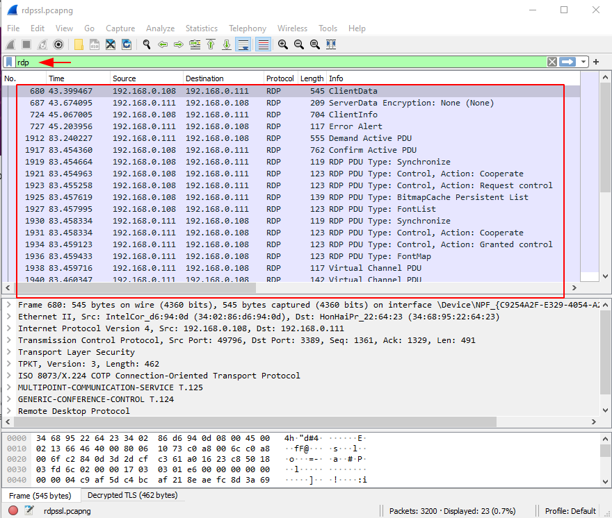 The RDP server DESKTOP-CDE7HJC was at IP address 192.168.0.111 in the pcaps we captured, and RDP traffic was carried out over TCP port 3389. This information was required in order for Wireshark to properly decrypt RDP traffic.