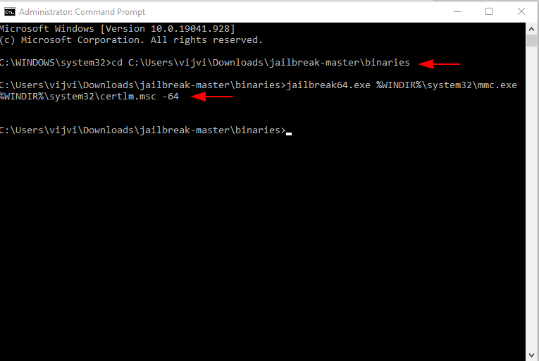 Then, open a Command prompt with administrator privileges and went to the directory of downloaded jailbreak binaries and execute the following command.