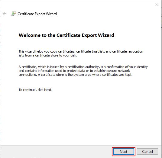 This will open up a Certificate Export Wizard… to export the Certificate just hit the “Next” button.