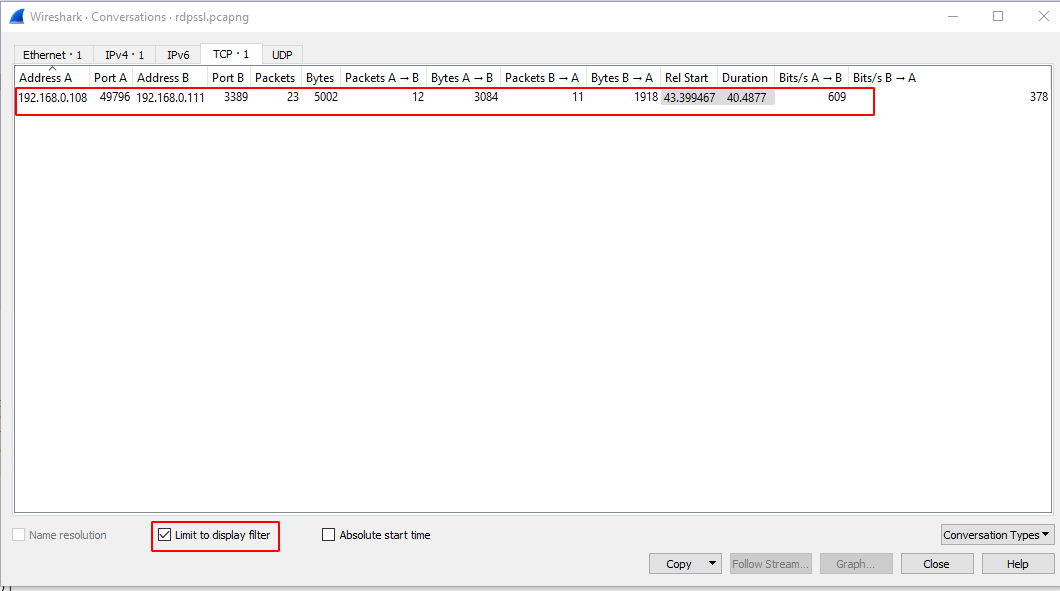 As we can see there is something that happened In the highlighted fields. I managed to understand they are using RDP protocol (port no.3389) but won’t able to able find out the actual duration of the connectivity between the client and the host so, I applied “Limit to the Display filter”