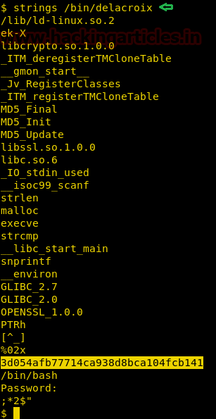 Now let’s see the contents of “/bin/delacroix” using strings function, here you’ll find an md5 hash